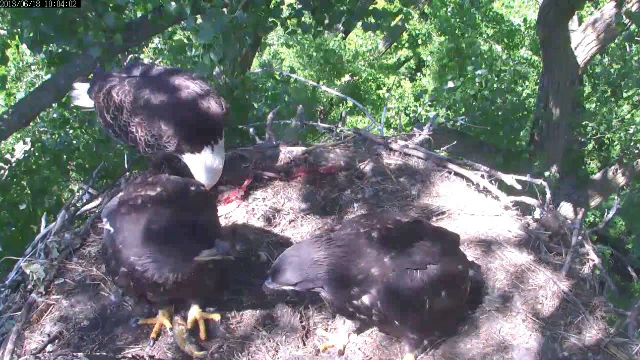 Tuesday started with a good breakfish of duck ala nest with the kids self-feeding and getting in a little food wrestling. Later in the morning more foodstuffs were delivered and the kids played a little keepaway again. Most of the day was spent relaxing, wingersizing and picking targets for the after fledge graduate course in survival. About 1:30 pm Dad delivered a fish that still had some life to it and Peace got the snatch and grab again. Harmony tried to steal it twice and in the process it looked like the fishy was lost over the edge of the nest. Peace managed to rescue the fish and proceeded to chow down. Harmony and Peace have both taken to perching on the twigs at the edge of the nest both to help develop talon strength and to scare the chatters once more before they fledge. A little beak bonking was seen today but no major disagreements. As darkness fell they kids were playing on the nest and getting ready for the long nap ahead.